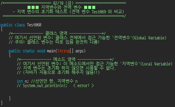 Scanner import 필수 클래스. 자동 임포트 단축키는 Ctrl + Shift + O import java.util.Scanner; Scanner 변수명 = new Scanner(System.in); * 참고: 입출력 스트림에 대한 이해 키보드나 마우스로 입력한 신호가 본체를 통해 서버로 출력. 서버가 출력한 데이터는 본체로 입력, 다시 모니터로 출력됨. 이렇게 일련의 흐름을 stream (하천, 흐르다) 이라 함. 입력문은 입력 스트림을 구현하는 문장이다. 예제4 (Scanner_01.java) import java.util.Scanner; public class Scanner_01 { public static void main(String[] args) { Scanner sc = new Sca..
